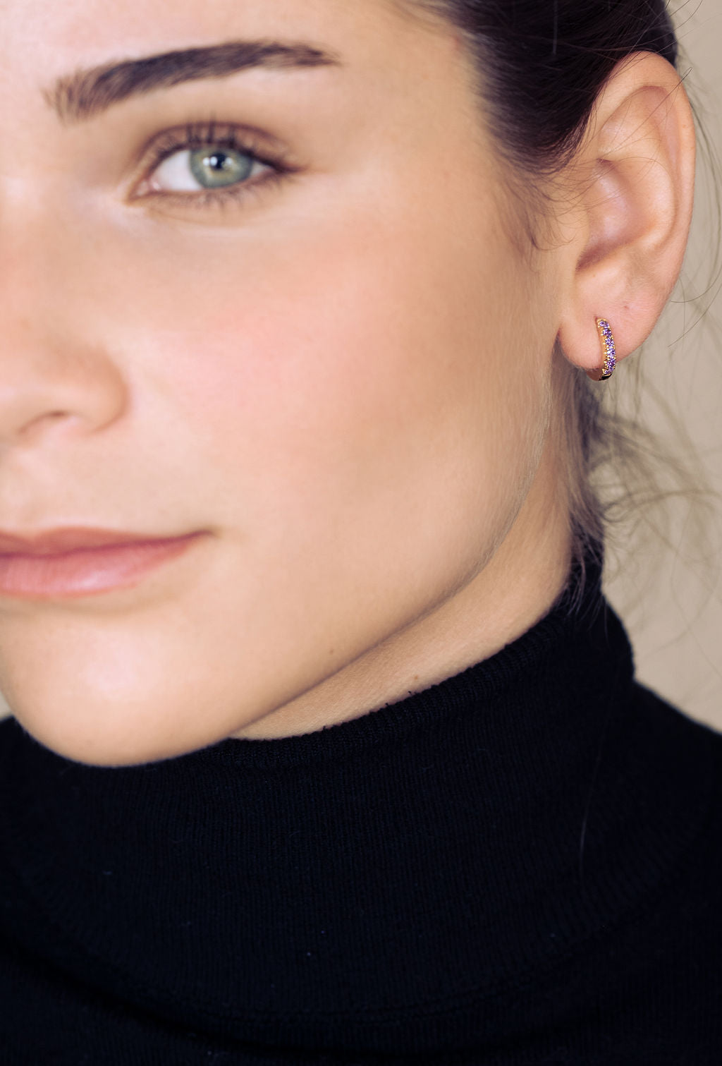 Orecchini a cerchio in argento rodiato o con placcatura in oro 18k e zirconi ametista.